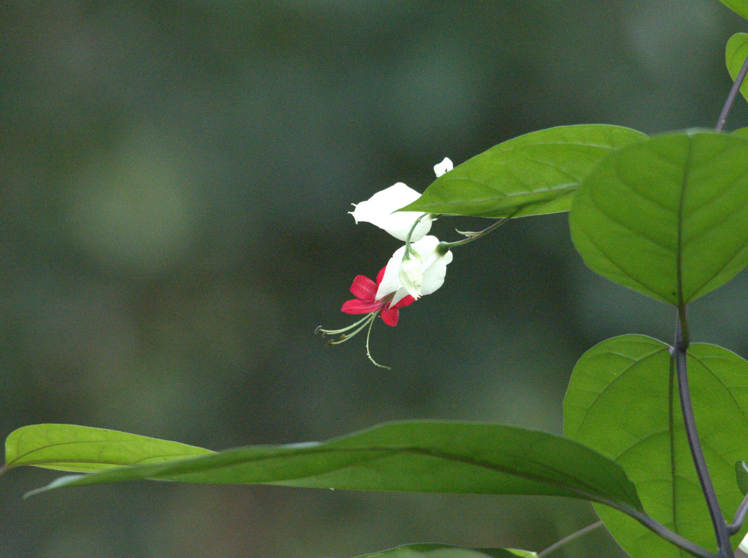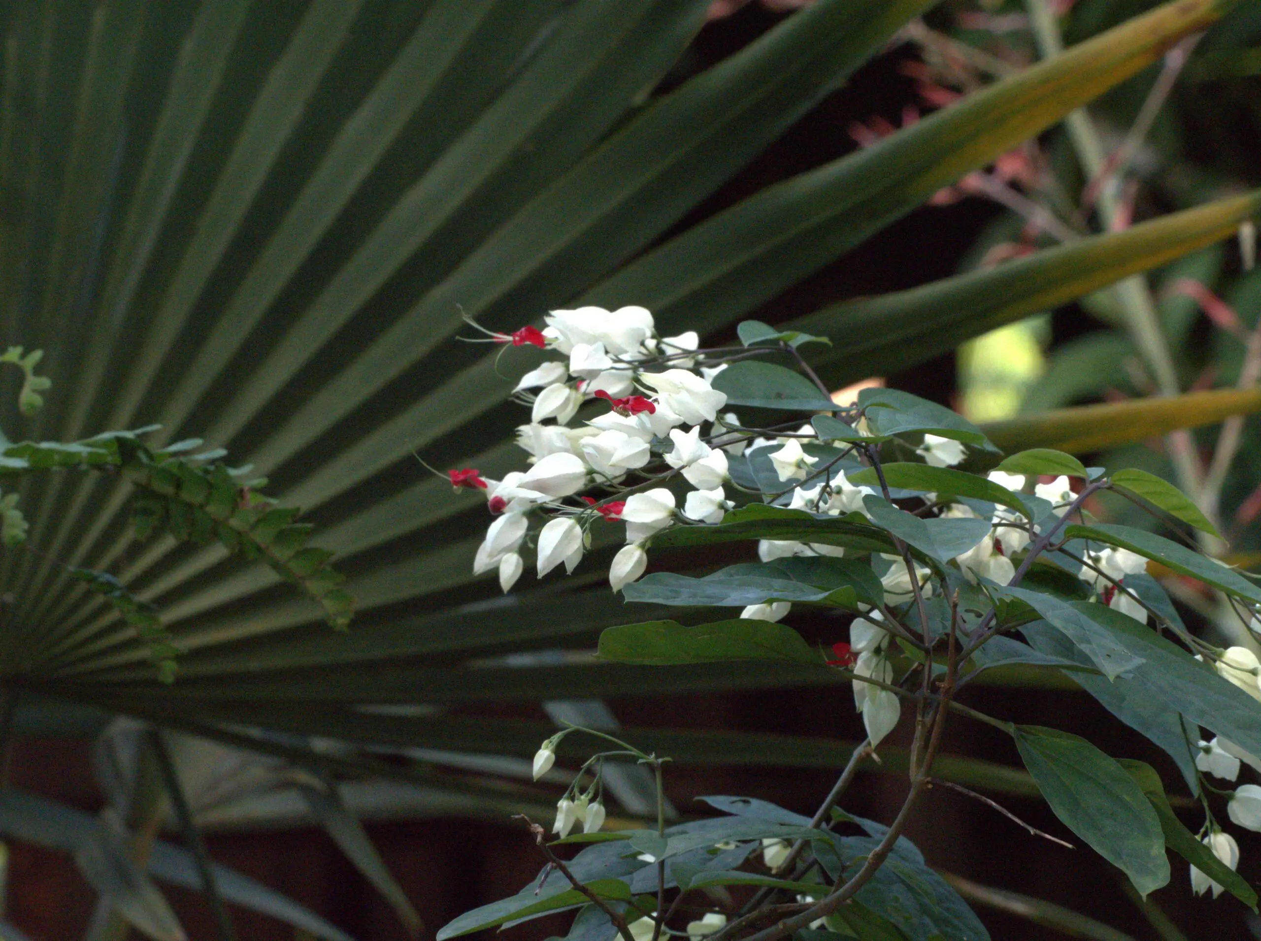 Originaire des zones tropicales d’Afrique de l’Ouest, du Cameroun jusqu’à l’ouest du Sénégal, cette liane sarmenteuse, sublime, est parfois envahissante dans nos jardins. Ses fleurs sont formées de bractées blanches en forme de cœur d’où jaillissent des corolles rouge vif qui lui ont valu des surnoms évocateurs tels que « gloire sanglante », « goutte de sang » ou encore « cœur saignant ».